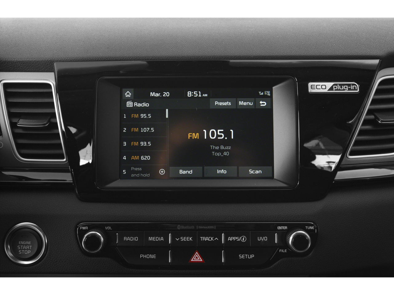 - Radio: AM/FM/MP3/SiriusXM Satellite -inc: 6 speakers, Bluetooth® wireless technology w/steering-wheel-mounted controls, 7" touchscreen w/UVO eco infotainment and support for Android Auto and Apple CarPlay, USB and auxiliary input jacks